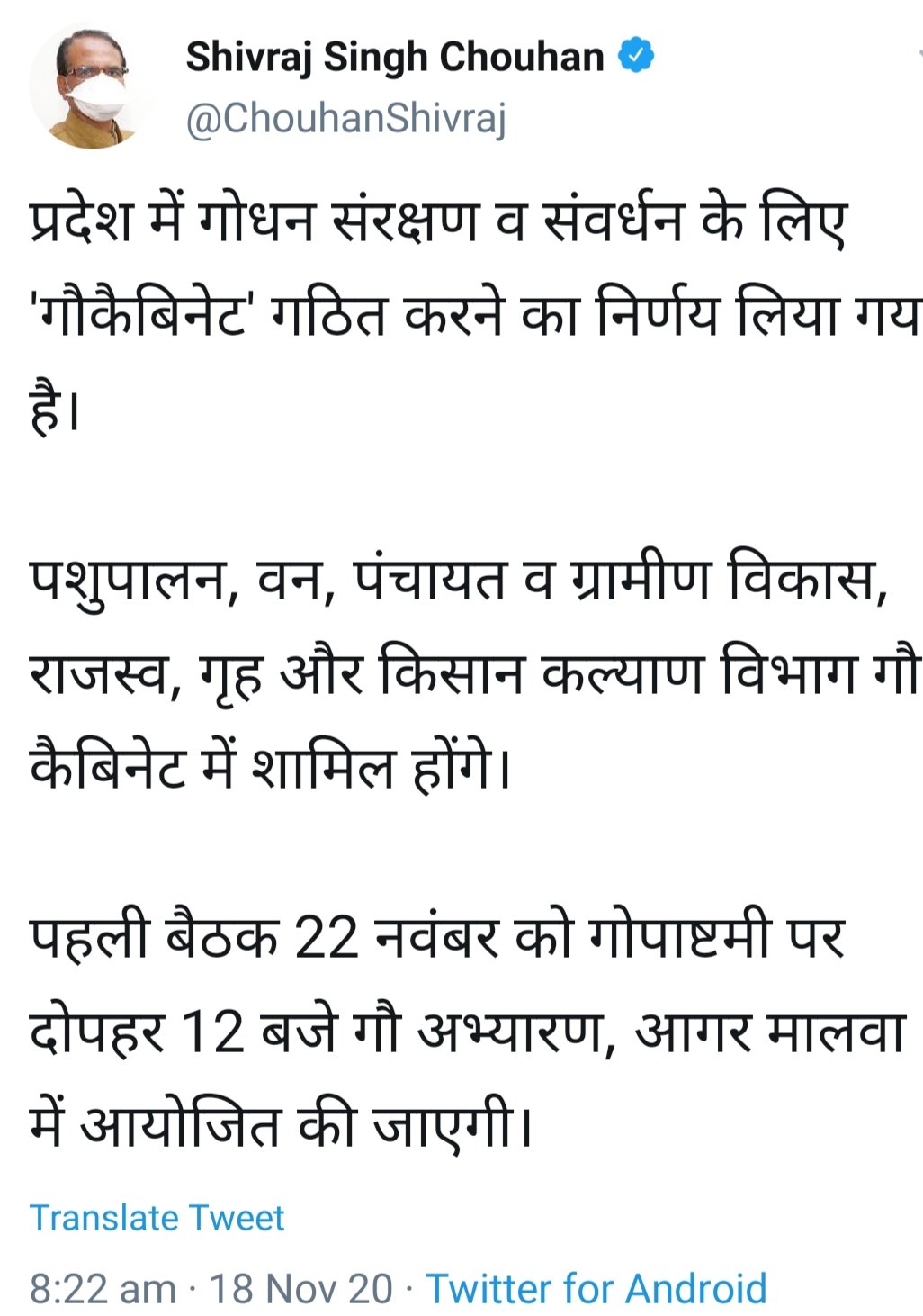 सीएम शिवराज सिंह चौहान ने ट्वीट कर कहा है कि प्रदेश में गोध सरंक्षण और संवर्धन के लिए गौ कैबिनेट गठित करने का निर्णय लिया गया है। पशुपालन, वन, पंचायत और ग्रामीण विकास, राजस्व, गृह और किसान कल्याण विभाग गौ कैबिनेट में शामिल होंगे। इसकी पहली बैठक 22 नवंबर को गौपाष्टमी पर दोपहर 12 बजे गौ अभ्यारण, आगर मालवा में आयोजित की जाएगी।