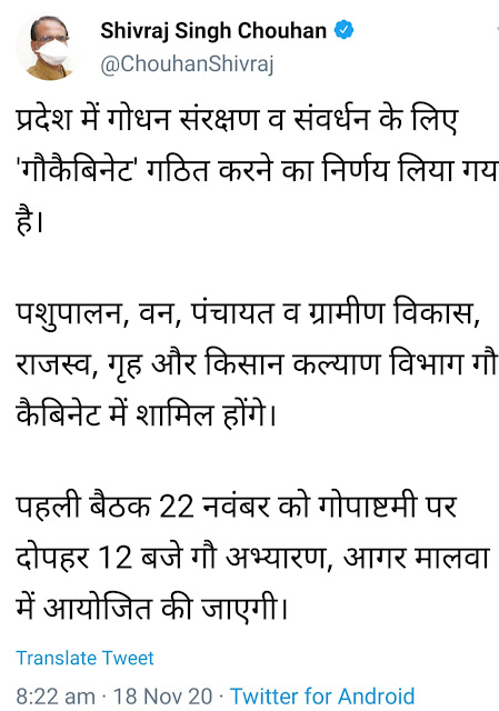 शिवराज सरकार ने गायों की देखभाल के लिए गौ कैबिनेट गठित किया है।