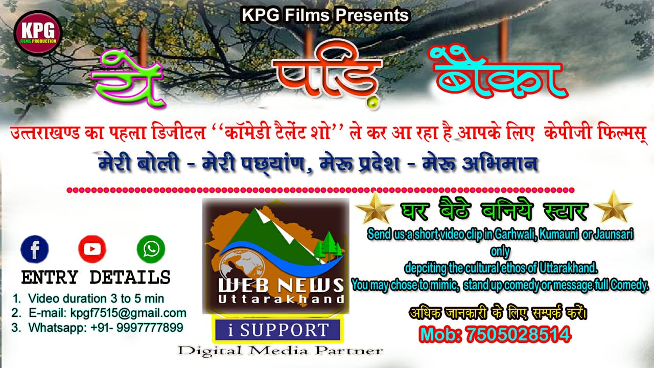 आपको जानकर खुशी होगी, उत्तराखण्ड की संस्कृति के प्रचार प्रसार के क्रम में आपका अपना web news uttrakhand “डिजीटल कॉमेडी टैलेंट शो” का डिजिटल मीडिया पार्टनर है । हमारे लिए सकारात्मक समाचारों के साथ साथ उत्तराखण्ड संस्कृति, भाषा बोली, पर्यटन, स्वरोजगार आदि से जुड़ी महत्वपूर्ण जानकारी प्रसारित करना  उद्देश्यात्मक कार्य है ।, आप हमें webnewsuttarakhand@gmail.com पर संपर्क कर सकते है ।